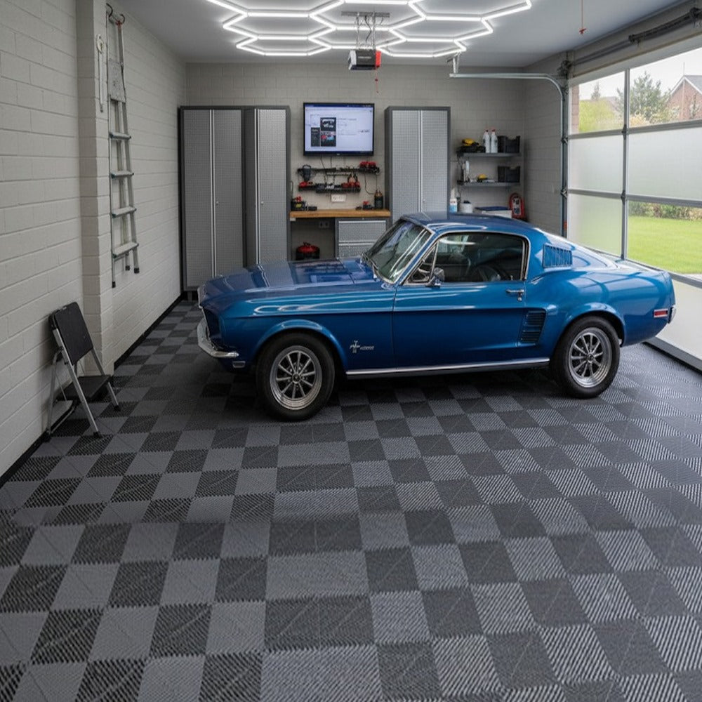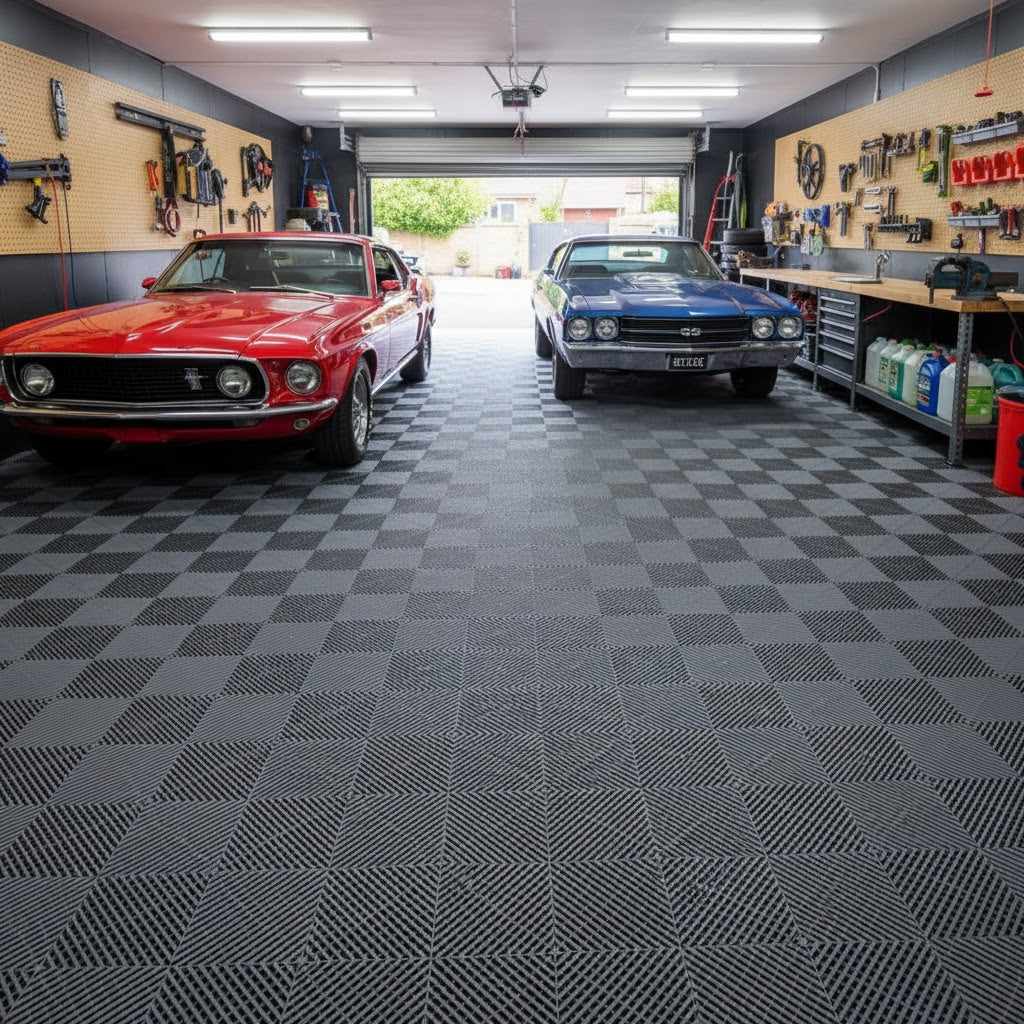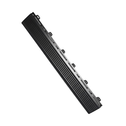 Non-slip ramp for modular floor tiles that improves safety and wheelchair access. Strong, lightweight, and quick to install without tools or glue.