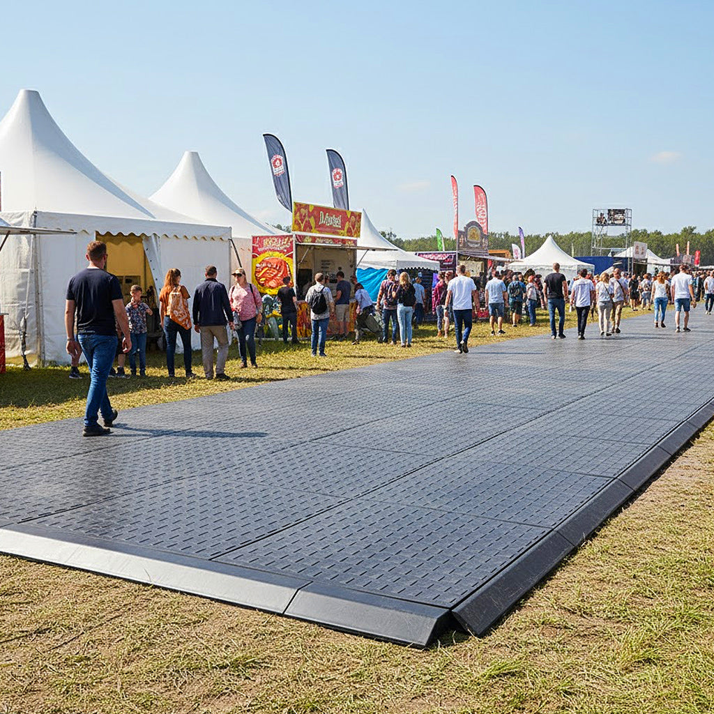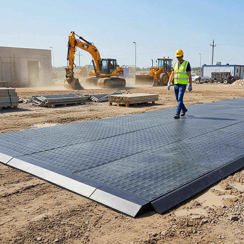 Durable ground protection mat with non-slip square top surface. Easy to install, eco-friendly, and strong enough for heavy loads.